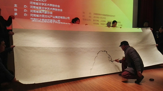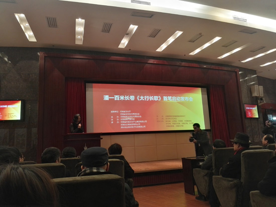 1月24日,由河南省文化厅、河南省文学艺术界联合会指导,河南省直文学艺术界联合会主办的潘一百米长卷《太行长歌》首笔启动仪式在郑州举行,据介绍,该作品完成后将于2019年在人民大会堂举行首展。