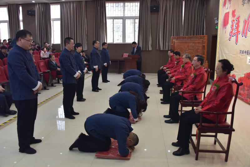 随着古乐的响起,拜师仪式正式开始。各位继承人向指导老师行跪拜礼、郑重的敬一杯茶,献上鲜花,递交“拜师帖”,表达了对老师的敬意,答谢老师收于门下,也表明了自己发奋努力、立志继承老师学术思想的决心。