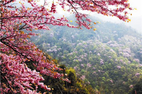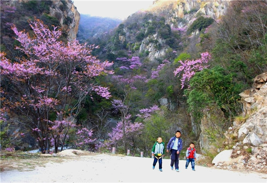 暮春四月,老君洞景区是紫荆花的海洋。老君洞景区分布着18万亩野生紫荆,每年的这个季节,春暖花开之时,18万亩紫荆花竞向绽放,漫山遍野一片红色的海洋,中间点缀着粉红色的野桃花,构成一幅绚丽多彩的画卷,蔚为壮观。老君洞野生紫荆花具有花株密、花期长、花形好、面积大等特点,在中原地区极为少见。受高山气候影响,紫荆花由山下而上次第开放,形成了花期较长、多姿变换的奇特景观。