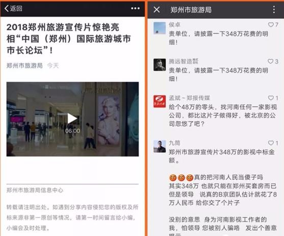 网友“九筒”:郑州市旅游宣传片348万的影视中标金的真的把河南人民当傻子吗?其实348万也就只能在郑州买套房而已,但是领导导说真的B京团队估计就花了8万人民币给你交了个片子。没别的意思身为河南影视工作者的我,怕领导您被别人骗,发出个善意提示。