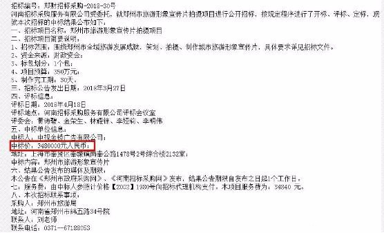 金口娱言查询获知,正如网友所称,这条郑州市旅游形象宣传片的中标价为348万元。