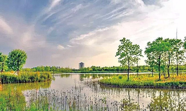 6月4日,临颍黄龙湿地保护区内湖水波光粼粼、树木郁郁葱葱。