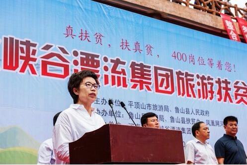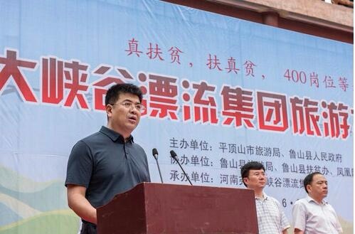 河南省旅游局副局长周耀霞在致辞中说,河南是传统农业大省和旅游资源大省,70%的旅游资源单体分布在农村,这为全省推进乡村旅游扶贫工作提供了良好的资源依托。近年来,乡村旅游不断升温,旅游扶贫在决胜小康社会中的作用日益凸显,乡村旅游扶贫成为各级各部门工作的重中之重。“河南尧山大峡谷漂流集团”揭牌成立,同时举办旅游扶贫行动大会,为贫困户提供就业岗位,为贫困学生设立助学基金,帮助家乡的困难群众改善生活条件,实现稳步脱贫,为平顶山市和鲁山县的旅游扶贫工作注入了新的活力。