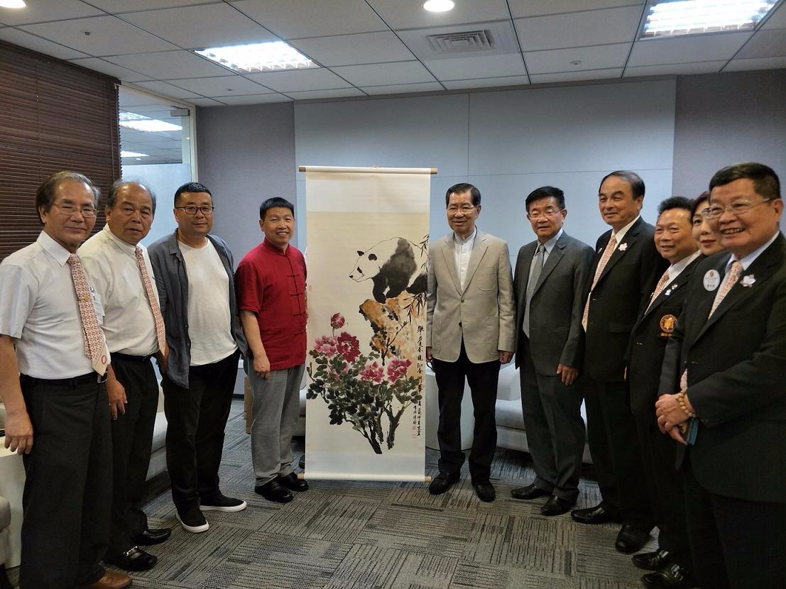 最后,萧万长和“境象——萧四五人文书画作品巡回展(台湾站)”主创人员及台湾萧氏宗亲总会一行合影留念。并叮嘱台湾萧氏宗亲总会要尽最大努力支持萧四五人文书画作品全球巡回展。萧四五将自己的熊猫系列作品《举步度春秋》赠送给萧万长先生收藏。