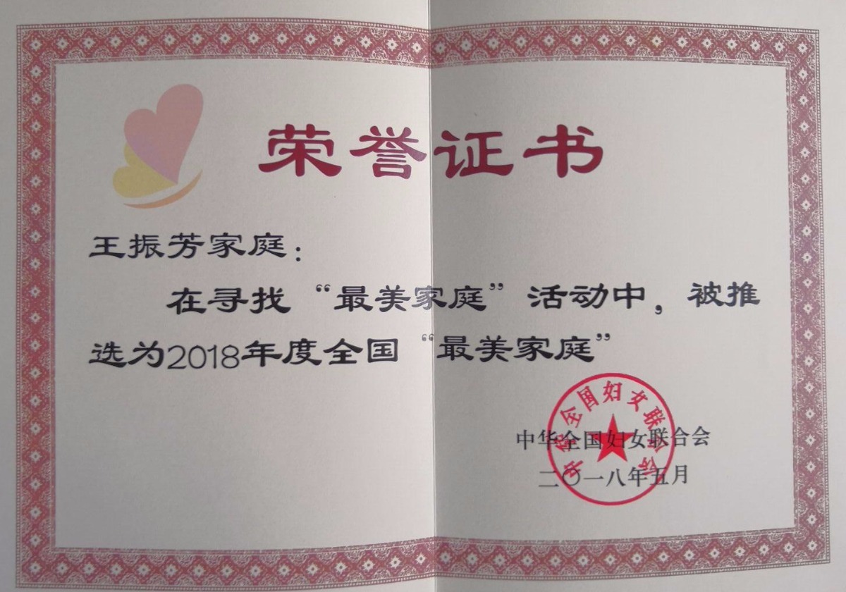王振芳2018年度全国最美家庭荣誉证书