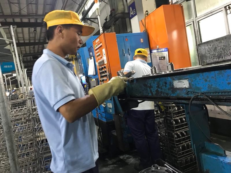 “我们的工作就是把这些压盘(空调内的一种圆形不锈钢配件)从那边用小推车推过来,然后再一个个送进第一个机器内。往输送链条上送的时候一定要注意这个豁口朝外,要不然机器不认,压盘出来不标准,就成次品了。现在还没事,等转正了,出一个次品是要扣钱的。第二道工序是把这些压盘送到旁边这台机器上校正,每6个必须校准一个,这叫抽检……”戴着厚厚的塑胶手套,王世华一边忙着干活,一边抽空讲解着工作要领。