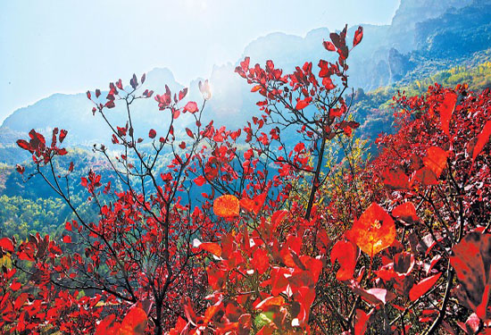 寒露时节,太行山脉红叶簇簇,美不胜收。图为10月10日,林州市石板岩镇车佛沟村的红叶美景吸引了大批游客前来,尽享中原大地的秋日韵味。