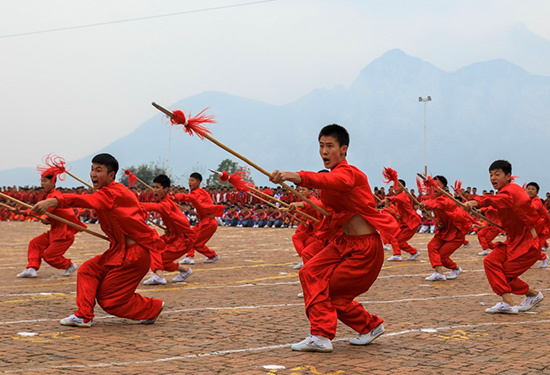 作为压轴的万人团体操《少林功夫》展演,现已成为登封乃至郑州宣传少林武术的一张特色名片。在少林景区内的塔沟武校祖源校区——少林武术博物院演武场,由塔沟武校16000余名学员演练,融合了少林十八般兵器、少林硬气功、少林集体棍、少林太极等多种功法演练。整场表演以壮观、震撼的宏大场面,排山倒海的气势,充分展示中国传统文化与武术瑰宝的独特魅力。
