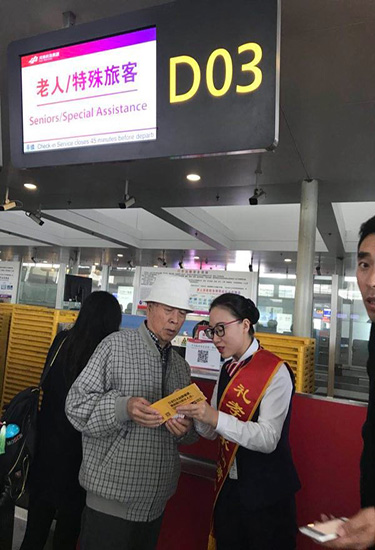 10月17日,郑州机场在T2航站楼4层出发大厅举办“礼孝传承 情满中原”主题活动,通过广播、视频等大力宣传“老人及特殊旅客”优先乘机,机场工作人员还向老年旅客送上节日祝福和精美小礼品,出行旅客若在活动现场拨打家中老人电话致以节日问候也可获赠小礼品。