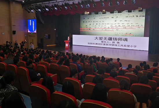 报告会上,信阳市浉河区董家河绿之风希望小学教师、李芳生前同事赵艳,信阳市浉河区董家河镇中心校学生、李芳的学生彭婧袆,信阳职业技术学院教师、李芳的老师熊可书,李芳的女儿代雨辰,信阳广播电视台记者王淑君,分别从同事、学生、老师、女儿、记者的角度,讲述李芳志的感人事迹,阐述了李芳不忘初心、潜心育人、敬业奉献、舍生忘我的高尚品德和优秀品质。
