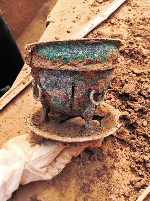 经过两个月的清理发掘,目前该座西汉墓葬清理出墓主人骨架一具,其葬具为双棺,棺内陪葬有大量的玉器。主墓室内不仅发现有大雁灯、铜盘等珍贵文物,还有铜镜、耳杯等遗物,在北侧一耳室内发现有大量的彩绘陶壶、铜盘、铜壶、铜炉、铜钵、铜盆、铜臼等。