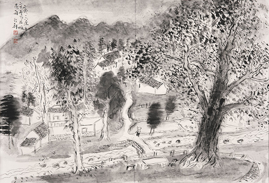观之桂行创的山水画,却流荡着一股生活气息。他的山不是范宽《溪山行旅》里的那种令人仰视的崔嵬之山,他的树不是李成的剑拔弩张的荒寒之树。他的山与树,寻寻常常,无萧杀,无荒寒,无仙气,无奇峰突起,无形销骨立。他的画里,通常安放着低矮的民居、林间的阡陌。山、树、房子是山水画的主要元素,只不过桂行创的笔墨语言,赋予了这些元素可亲可近的色彩,赋予了寻常的人烟出没的气息。