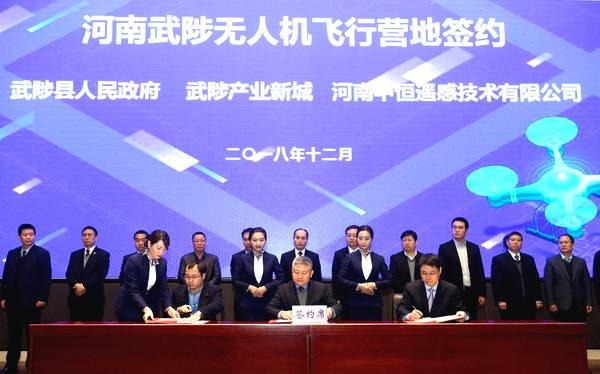 12月8日,武陟县首届无人机应用服务成果展暨签约仪式举行,与会领导共同为武陟产业新城无人机产业基地揭牌。