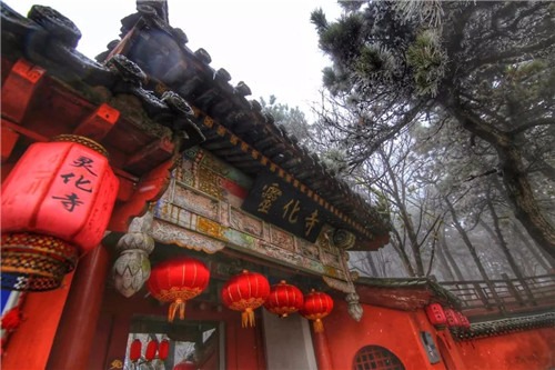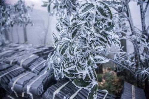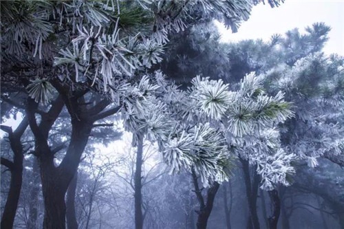近日恰遇寒潮袭来,鸡公山雨霜融洒,雾凇满挂;午时伴细雪飘洒,静美无声。