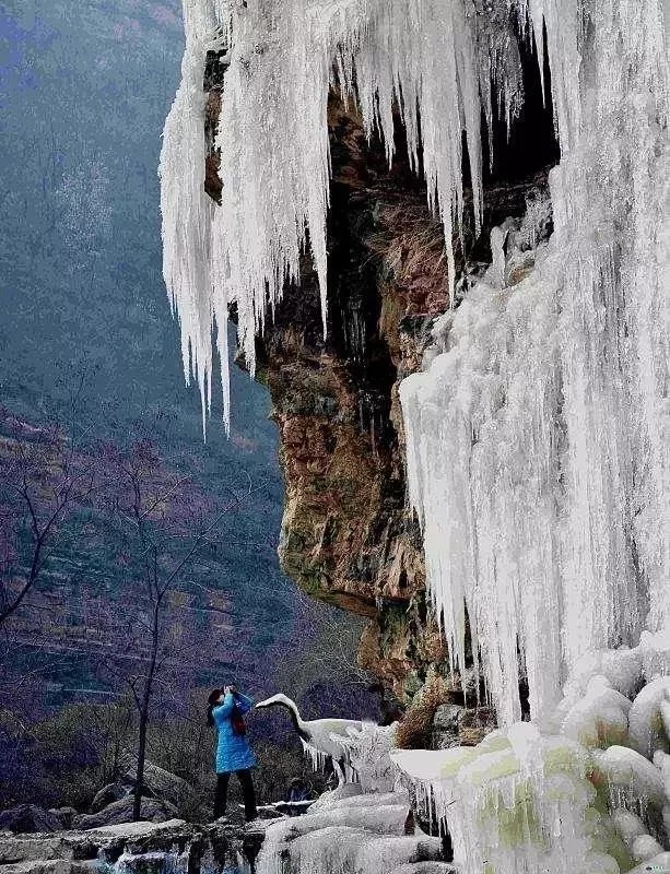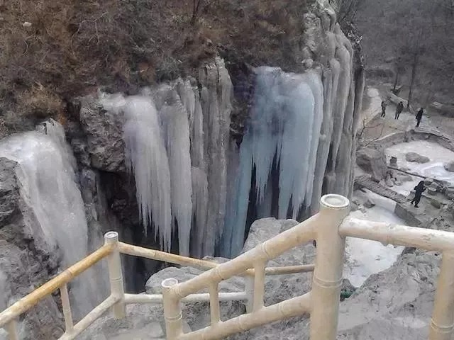 远远望去,巨大的冰瀑、冰幔从山崖上悬垂而下,或攀附岩壁,或连挂树枝,犹如天然山水画,气势磅礴,蔚为大观;近看,冰瀑、冰帘如座座冰雕,玲珑剔透,千姿百态,或神似罗汉怒目,或形如蛟龙取水,或状如老子骑青牛,或润如串串晶莹葡萄,美轮美奂。冰瀑最厚处在半米以上,层层叠叠,形成或大或小的冰挂水帘洞,洞内滴水不断。