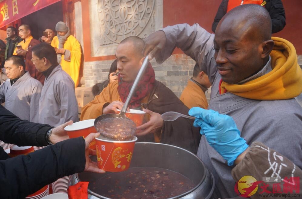 当日上午,释永信等携众弟子在少林药局门前为海内外游客和信众施粥,吸引众多民众前来「讨粥喝」,现场还有一些外国友人。一位领到腊八粥的游客告诉记者:「能喝上一碗少林五行腊八粥,真是福气」。