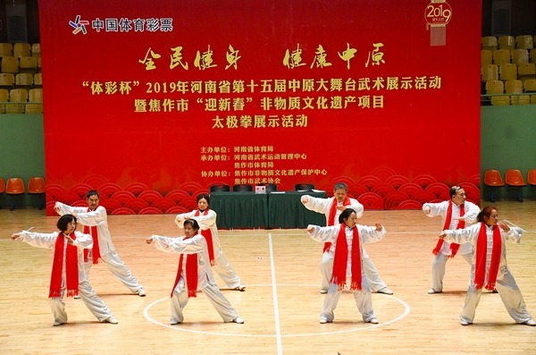 在“全民健身 健康中原”2019年河南省第十五届中原大舞台武术展示活动暨焦作市迎新春非物质文化遗产项目太极拳展示活动中,来自全省各地市73支代表队千余名太极拳、少林拳等拳术门派武林高手登台献艺,展示太极拳、少林拳、心意六合拳、查拳、八卦拳、岳家拳、猿仙通背拳等传统武术拳术和武术器械,充分展示中原武术的魅力。