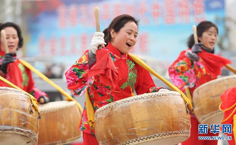 2月16日,河南省武陟县圪垱店乡群众在进行盘鼓表演。