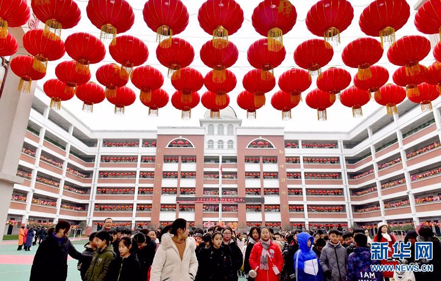 2月17日,河南省汝阳县实验小学形态各异、五颜六色的灯笼把校园装扮得异常漂亮,3000余盏灯笼全部由学生用废纸盒子等原料制作而成。小朋友们自己动手制作灯笼,欢欢乐乐闹元宵。