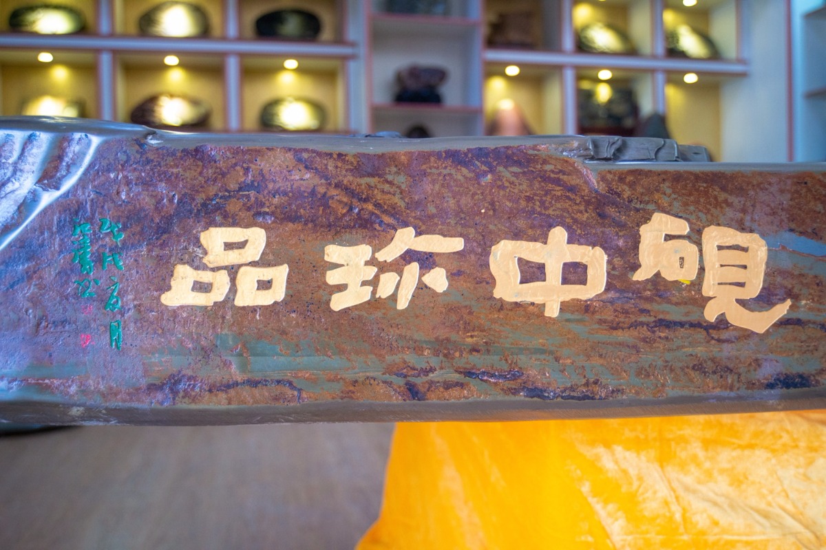 巨型黄石砚是以黄石砚产地的名山“黄石山”为题材,还原了《史记》中黄石公给张良送书的故事场景,砚台上方黄石山山门耸立,河流旁张良骑着牛准备过桥,黄石公在不远处树下对弈,匠人利用石上俏色雕刻出了苍松怪石、翠竹花鸟、小桥流水等景观。