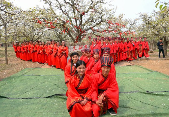 大公网讯(高攀)4月4日,宁陵县万亩梨园景区,春和景明,游人如织,梨花飘香,温馨浪漫。景区广场四周上空红色的氢气球随风摆动,欢快的音乐激荡人心,广场正中心整齐有序的摆满了26张汉式几案,每个几案前方放了一个铜盆,两侧放了两个古色古香的座垫,上面放有汉盘和葫芦杯等道具,这是宁陵县为26对新人举办汉式集体婚礼的现场。