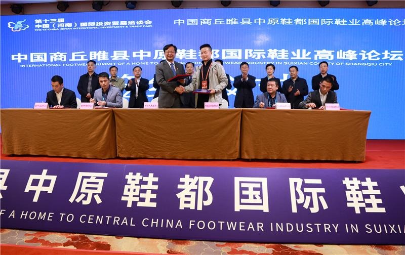 论坛签约仪式上,睢县县长曹广阔代表睢县分别与河北雄安豪登鞋业有限公司、特步中国有限公司、河北森茂鞋业有限公司、福建仰光鞋业有限公司、晋勇(清远)橡胶工业有限公司等5家企业签订了雄安制鞋产业园、特步鞋服、森茂鞋业、万盛鞋业、晋勇(清远)橡胶鞋材等5个项目合作协议。