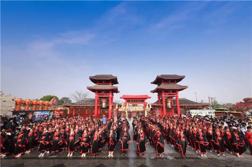 4月10日,在国家AAAAA级旅游景区——开封清明上河园迎宾门广场,来自安徽省颖上第五中学的近千名身着古装的学生齐聚于此,在广场上开展“千名学生咏宋词”的活动。在老师的引导下,共同诵读宋朝民族英雄岳飞的《满江红》!
