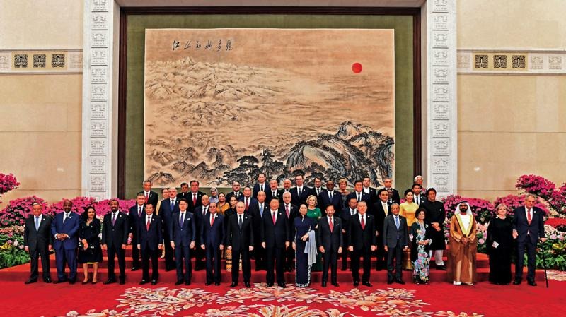 图:4月26日,中国国家主席习近平和夫人彭丽媛在北京人民大会堂举行宴会,欢迎出席第二届“一带一路”国际合作高峰论坛的外方领导人夫妇及嘉宾。这是习近平和彭丽媛同外方领导人夫妇及嘉宾合影留念 新华社