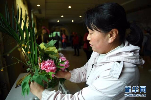 工作人员在洛阳国家牡丹园牡丹展览馆中插花(新华社记者李嘉南摄)