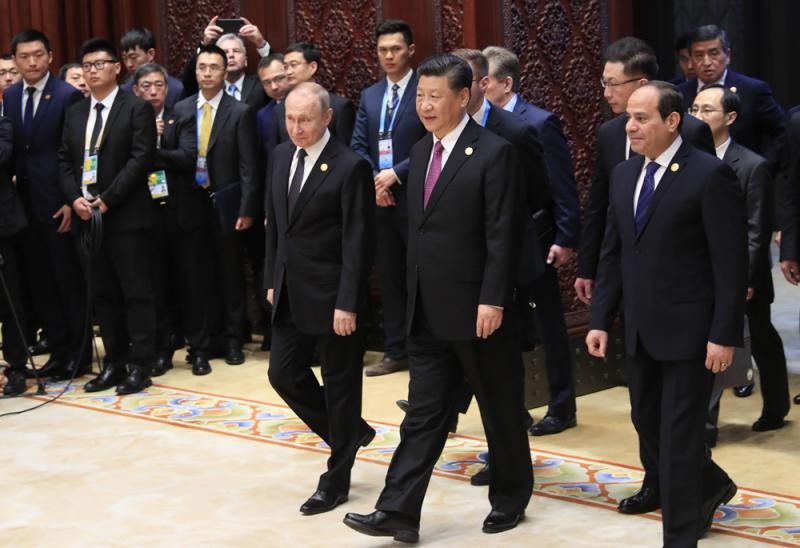 图:4月27日,第二届“一带一路”国际合作高峰论坛在北京雁栖湖国际会议中心举行圆桌峰会,中国国家主席习近平主持会议并致开幕辞。图为习近平同与会贵宾入场\资料图片