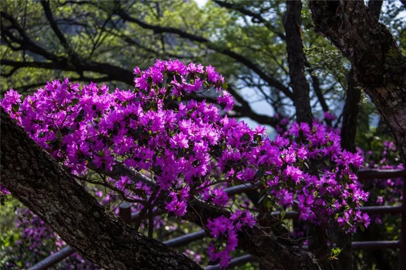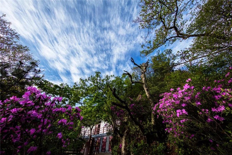 老君山的杜鹃花品种繁多,最常见的有太白杜鹃和秀雅杜鹃,它们生长在1800米以上的高海拔地带,树高1-8米,由于气温多变,所以开花期晚,一般在5月初盛开。