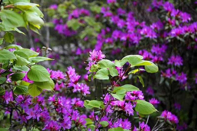 柔软如绢的花瓣簇拥成花团,一枝枝,一簇簇,或零星点缀在林中草木间,或成片怒放于山岭之上,在连绵的山野中竞相争艳,展示着高山花卉的魅力。