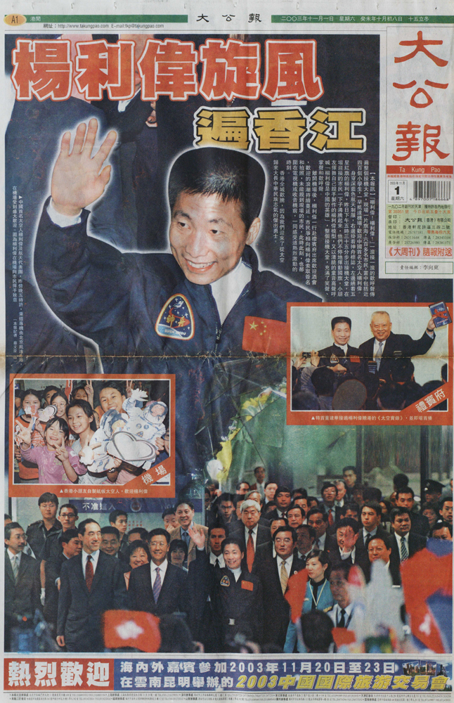 二○○三年五月,中国神舟五号首次成功载人航天飞行。同年十月三十一日到十一月五日,特区政府邀请到杨利伟来访香港,并同时借来神舟五号太空舱等实物在香港展出。藉着这股热潮,《大公报》和教统局合作举办“神舟五号升空徵文比赛”,收到来自大、中、小学的逾一千二百篇参赛作品,许多参赛学生都在参赛徵文中热情洋溢地表达了对中国科技成就的欣喜与身为中国人的自豪感。