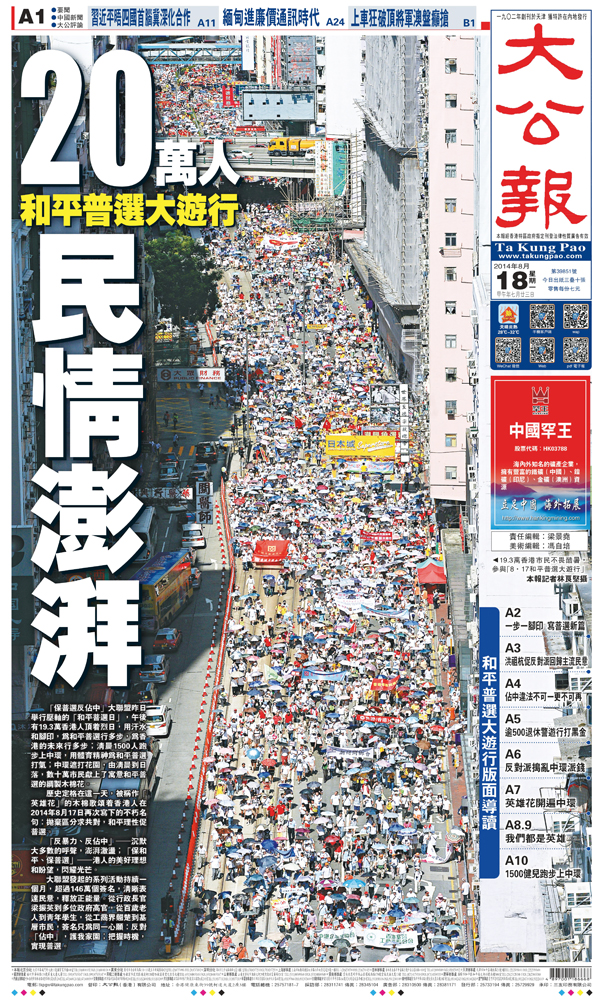 《大公报》在这场斗争中旗帜鲜明,揭露“佔中”搞手的真面目,号召民众表明反“佔中”、反“港独”的民意,坚决支持特区政府拨乱反正,支持警方执法,让香港回復法治秩序。
