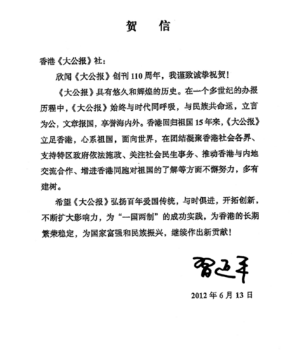 二○一二年,习近平主席为《大公报》创刊一百一十周年发来贺函,赞扬《大公报》百年来“与时代同呼吸,与民族共命运,立言为公,文章报国”,勉励《大公报》弘扬百年爱国传统,继续作出贡献。