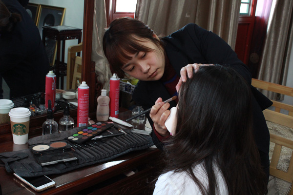 在大北照相馆前门店,拍摄前,化妆师在为顾客认真化妆。(张文杰摄)