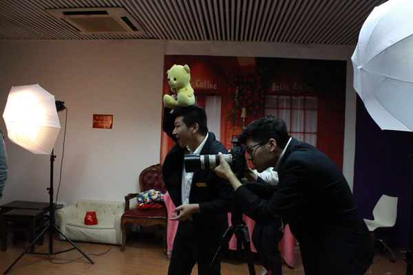 俩摄影师在为顾客拍照。瞧那专业劲,被帅哥的眼神秒杀到了。(李晓蓉摄)