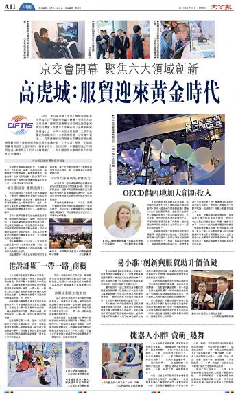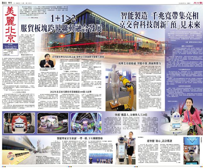 北京市委常委、宣传部长杜飞进上午看望、慰问参与京交会报道的前方记者。在大公报大公网访谈间,他饶有兴味地查看了大公报相关报道和新媒体平台的直播专题页面,现场对关于京交会全媒体的报道给予充分肯定。