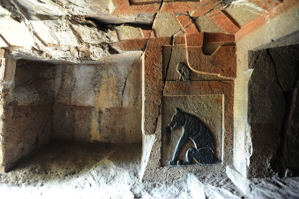 最为奇特的是郪江汉崖墓金钟山崖墓群一号墓里,有一副“狗拿耗子”的浮雕。我们平常都说“狗拿耗子,多管闲事”,难道古人有另外见解?原来据说猫在后来才从波斯传入中原,而西汉到三国的这段时期,狗才是捕鼠的主力。从五行上看,因为狗属土,老鼠属水,以水克土,狗把老鼠咬了,就能确保墓室主人不受老鼠的侵扰,因此在当时狗咬耗子绝非多事。