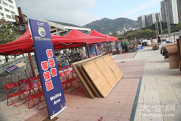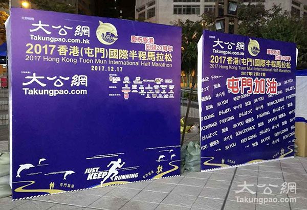 记者在香港(屯门)国际半程马拉松现场看到,所有的准备工作已经全部就绪,屯门天后庙广场舞台一侧有此次赛事主办方大公网的logo背板。