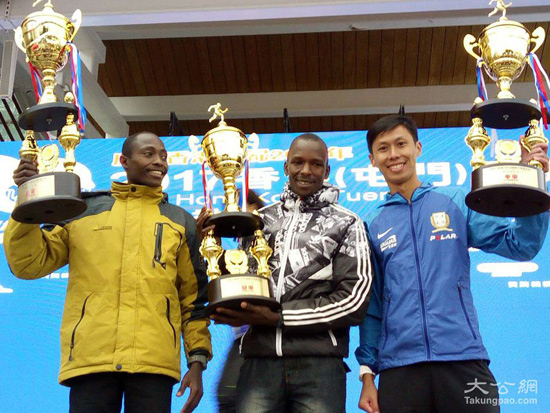 香港(屯门)国际半程马拉松男子壮年组颁奖仪式, SAMUEL·KIBIWOT 、WILLY KIPKEMOI·ROTICH 、Ka Ho·Chan分获冠亚季军。