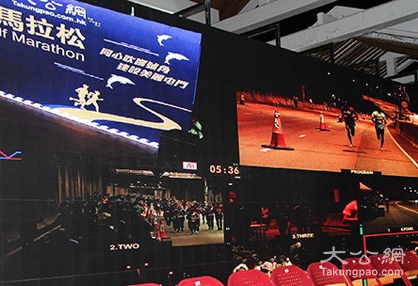 记者在香港(屯门)国际半程马拉松现场看到,所有的准备工作已经全部就绪,屯门天后庙广场舞台一侧有此次赛事主办方大公网的logo背板。