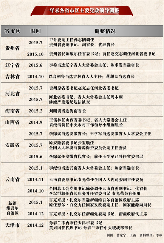 梳理公开资料可见,一年多来,省级党委、政府一把手出现人事调整的十个省市区,除了天津之外,其它均属欠发达地区。当中包括,辽宁--近两年中国政坛的“黑马”李希,2014年刚刚由上海市委副书记调任辽宁省长,跻身正部级,一年之后又再升省委书记,执掌GDP位居全国第七的工业大省。陈求发从湖南省政协主席任上调往辽宁,接替李希出任省长。