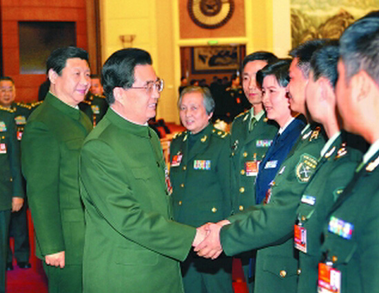 中共十七届五中全会决定,增补习近平为中央军事委员会副主席。图为2011年3月,时任中央军委主席胡锦涛,出席十一届全国人大四次会议解放军代表团全体会议,时任中央军委副主席习近平出席会议。