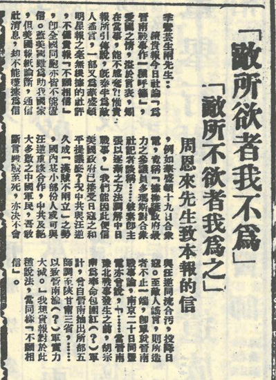 虽然《大公报》只是民间报纸,但在当时比《中央日报》影响要大得多,当时周恩来看到社评后认为需要认真对待,便当夜疾书一封,遂有此文。