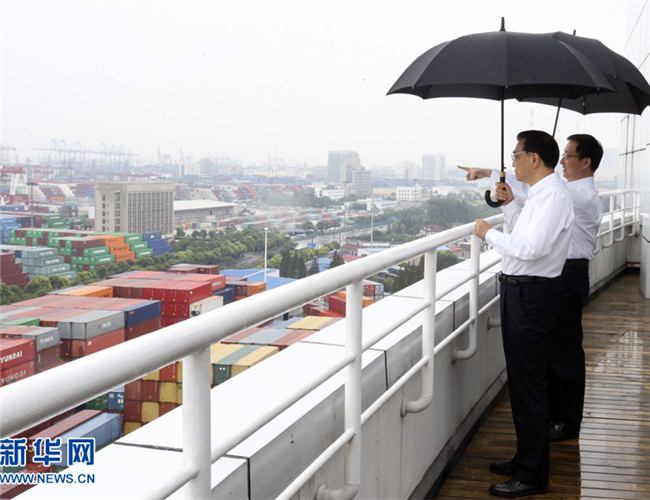 2014年9月19日,李克强在上海市委书记韩正陪同下,考察上海自贸区外高桥物流中心。(资料图)