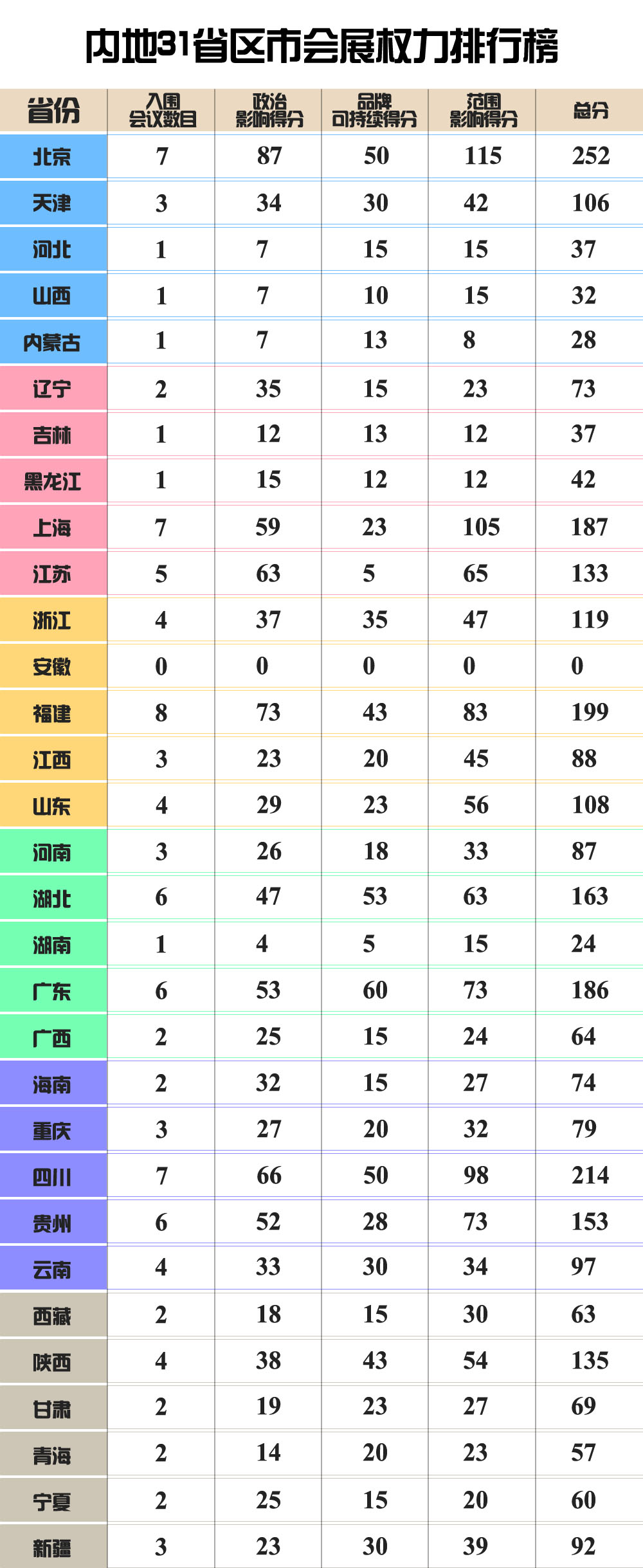 随着中国对外交流与开放的不断深化,会展业迎来了发展春天。与此同时,地方也日益认识到会展业之于省内政经发展的重要性,各地开始兴办越来越多的展会或论坛,或者提出成为本区域或者全国性的会展之都。大公研究院结合这一趋势,特推出《内地31省区市会展权力排行榜》,侧重从政治影响力方向来观察内地诸省份的会展业发展。