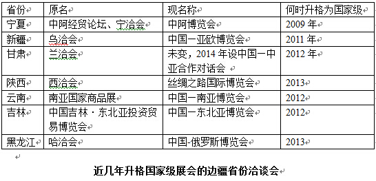 梳理内地31省会展活动发现,随着内地对外交流和开放的活动,一些边疆省份的X洽会均在2010年前后由省级升格为国家级,并变成中国——X博览会等模式,并由此完成了从地方性展会向国际区域性展会迈进。