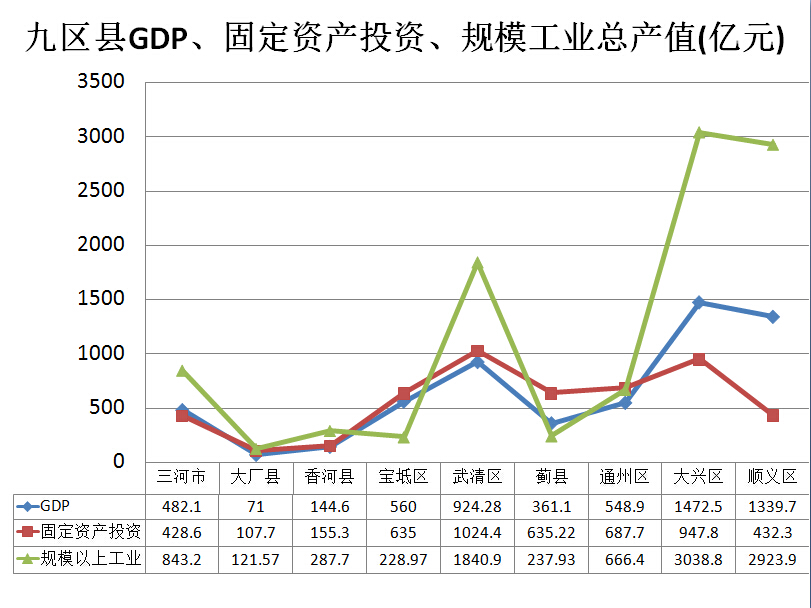 这张图是九区县GDP、固定资产投资、规模工业总产值之间的关系。可以看出,三河、大厂、香河、武清、通州的固定资产投资、规模以上工业与GDP总量的关系比较一致,即固定资产投资接近或略高于GDP,规模以上工业产值高于固投(通州略低于)。