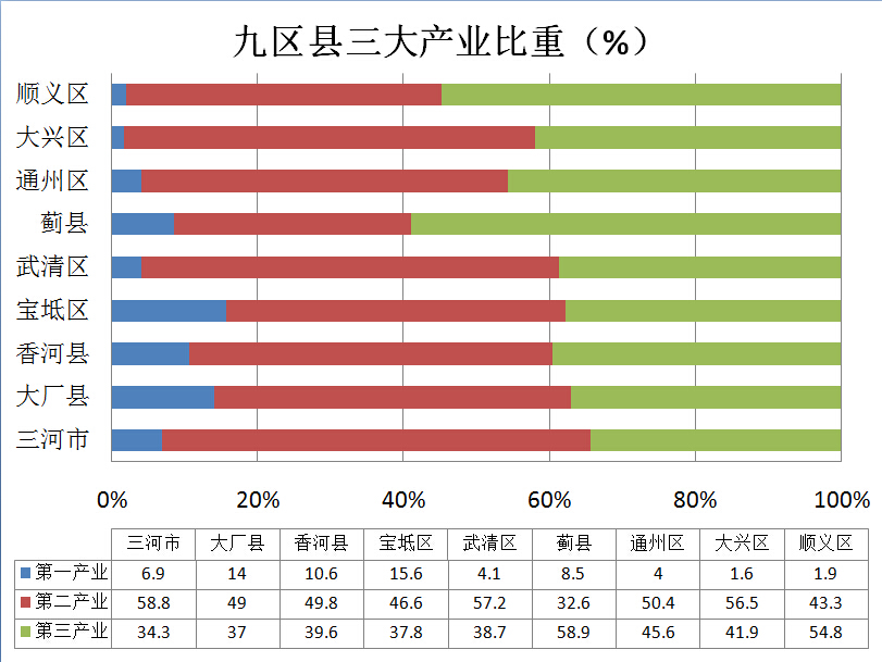 同时我们也能看到,九区县的第三产业除顺义区、蓟县外,其他比重都没有过半。蓟县因为是依托自然生态和历史文化资源,把旅游业定位为主导产业,所以它的第二产业不高。所以九区县主要还是第二产业在主导。